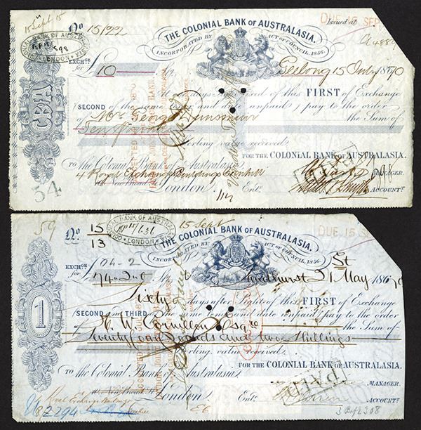 Australia. 1860's 1st of Exchange form with 1870 date handwritten. City of issue written next to date including Sanhurst and Geelong. Both are payable in London. Numerous endorsements and hand stamps. POCs, English Revenue Bill stamps on back of each. Top right corners removed intentionally by bank, possibly as a from of cancellation. Fine to VF condition. 2 pieces.