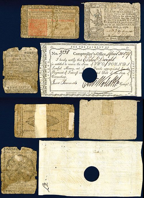 Lot of 4 notes, Includes Virginia, Oct. 7, 1776, $6, VG, partially repaired; New Jersey, March 25, 1776, 3 Shillings, VG with reinforced split and Continental Currency, February 17, 1776, 1/6th of a Dollar, VG with edge faults, small tears and high wear. Also included is a 1789 Connecticut Comptrollers Certificate, 2 Pounds, POC's, VF.