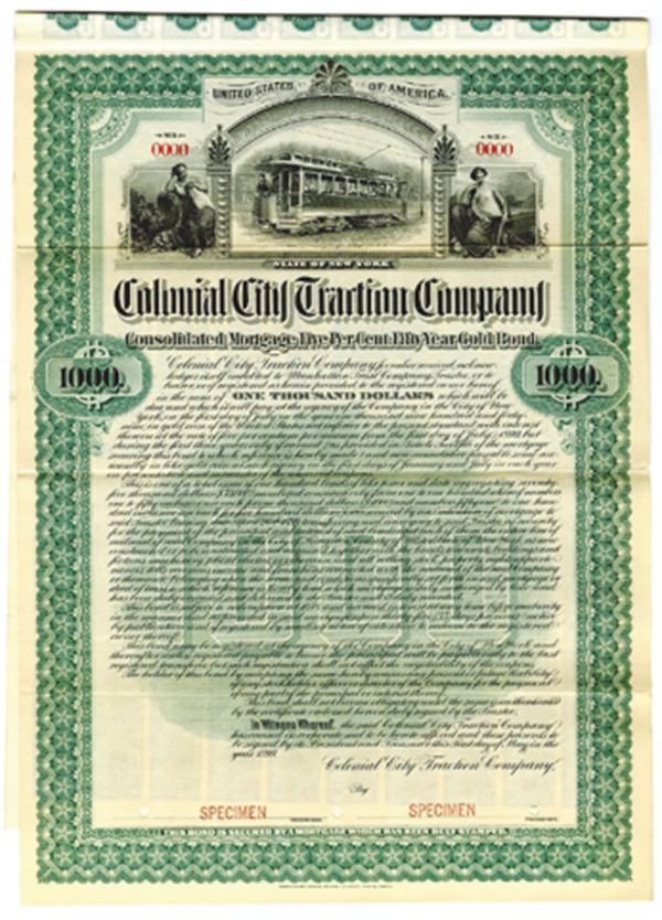 New York. $1000 Specimen 5% Consolidated Mortgage Gold Coupon Bond, Black print on green border and under tint, Allegorical women at top flanking electric street car at top, Specimen overprints and POC's, Fine-VF condition, ABNC.