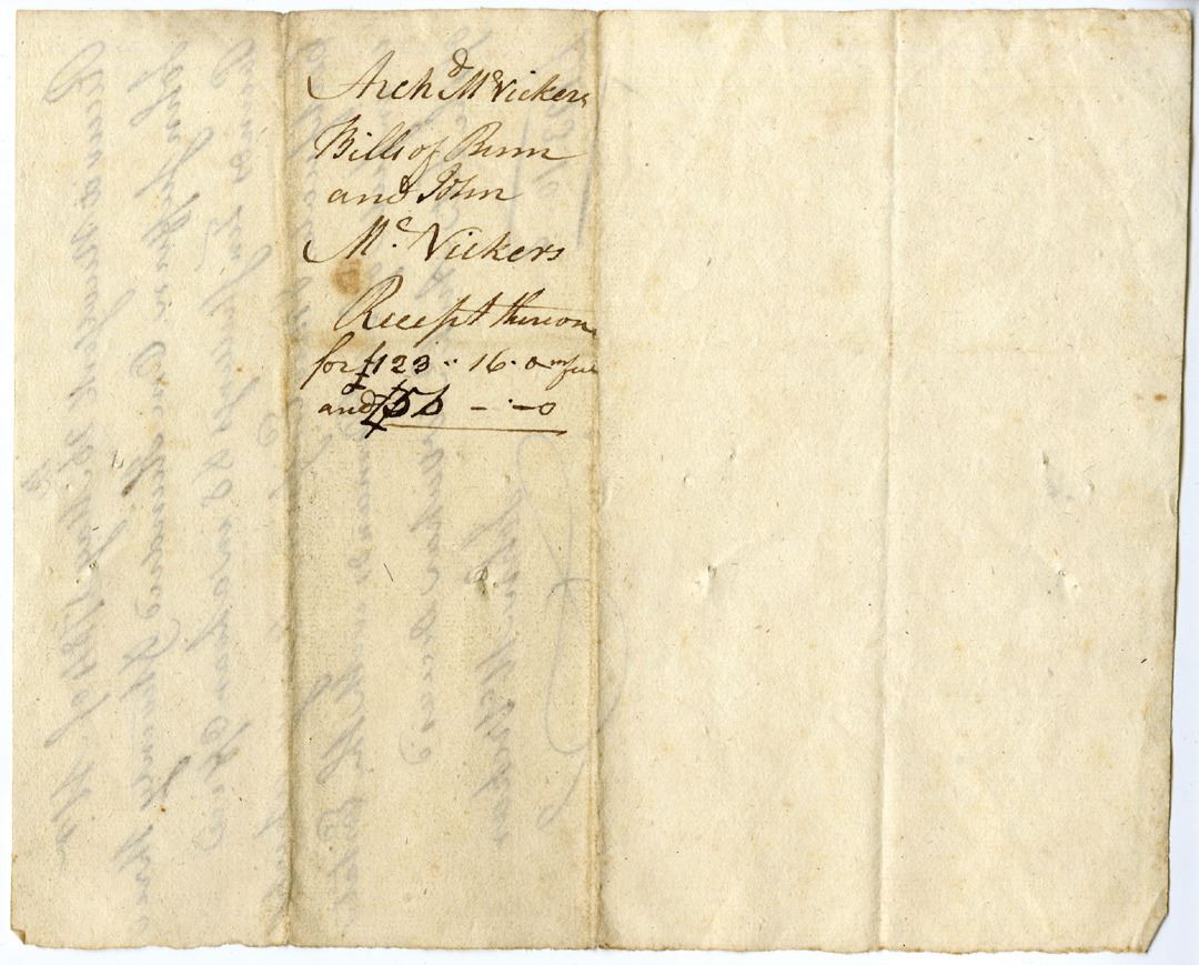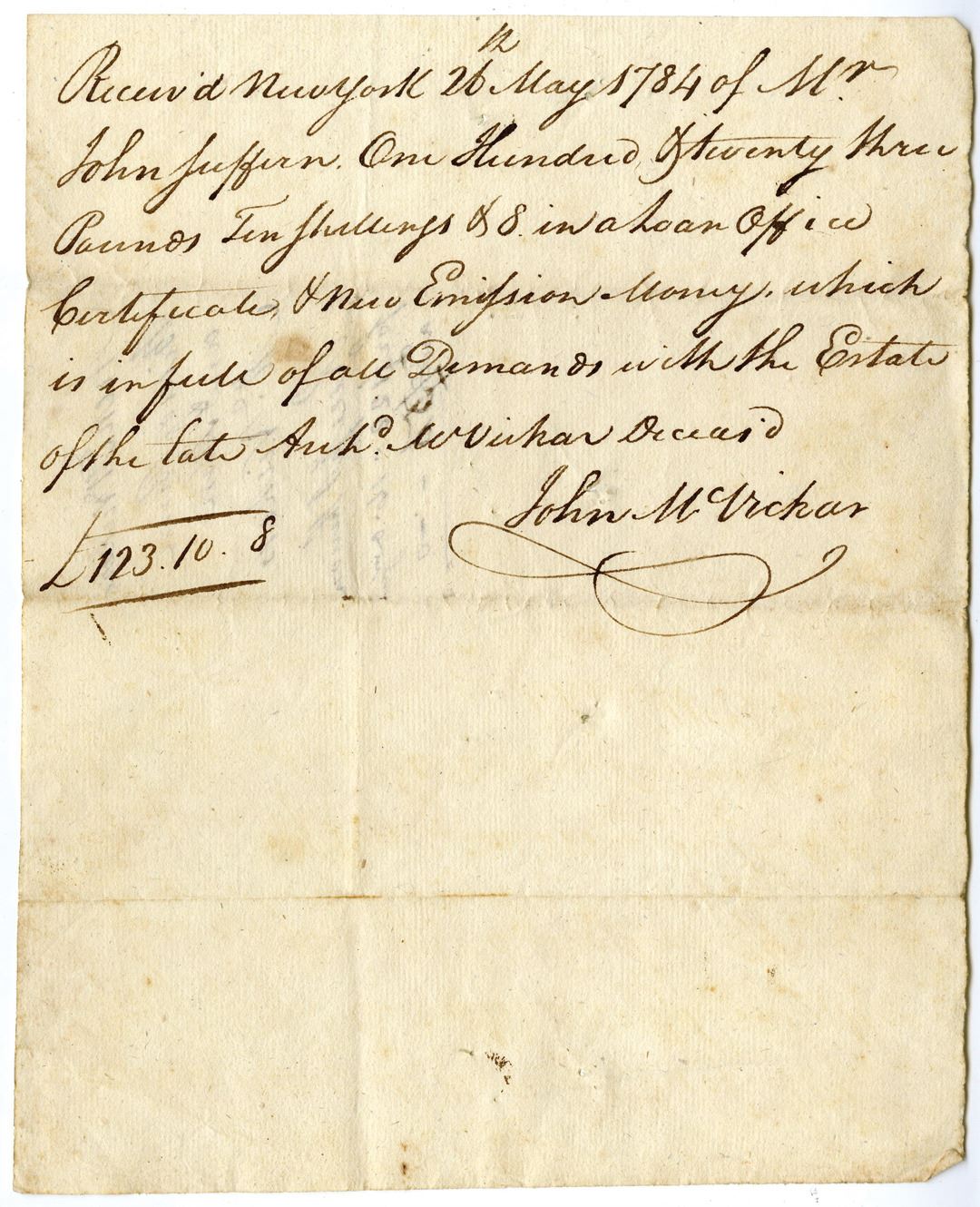 New York, 1784. Handwritten Payment Receipt Issued to John M. Vickar (or Vickers, spelling varies from front to back), received of John Suffern, the sum of 173 Pounds, 10 Shillings, and 8 Pence "in a Loan Office Certificate & New Emission Money, which is in full of all Demands with the Estate of the late Arch. M. Vickar Deceas'd." Signed by John M. Vickar's signature at center right. Fine-VF condition with some toning and few ink stains, still in great condition for its age. The village of Suffern was founded in 1796. John Suffern, first Rockland County judge, 1798-1806, settled near the base of the Ramapo Mountains in 1773, and called the place New Antrim, after his home in County Antrim, Northern Ireland. New Antrim's location was considered strategically important in the Revolutionary War because it was at an important crossroads near Ramapo Pass. General George Washington and other important military leaders used John Suffern's home as headquarters when they were in the area. The White Marsh mentioned in this piece may be related to the Battle of White Marsh (or Battle of Edge Hill), which was a battle of the Philadelphia campaign of the American Revolutionary War fought December 5-8, 1777, in the area surrounding Whitemarsh Township, Pennsylvania. The battle, which took the form of a series of skirmish actions, was the last major engagement of 1777 between British and American forces.