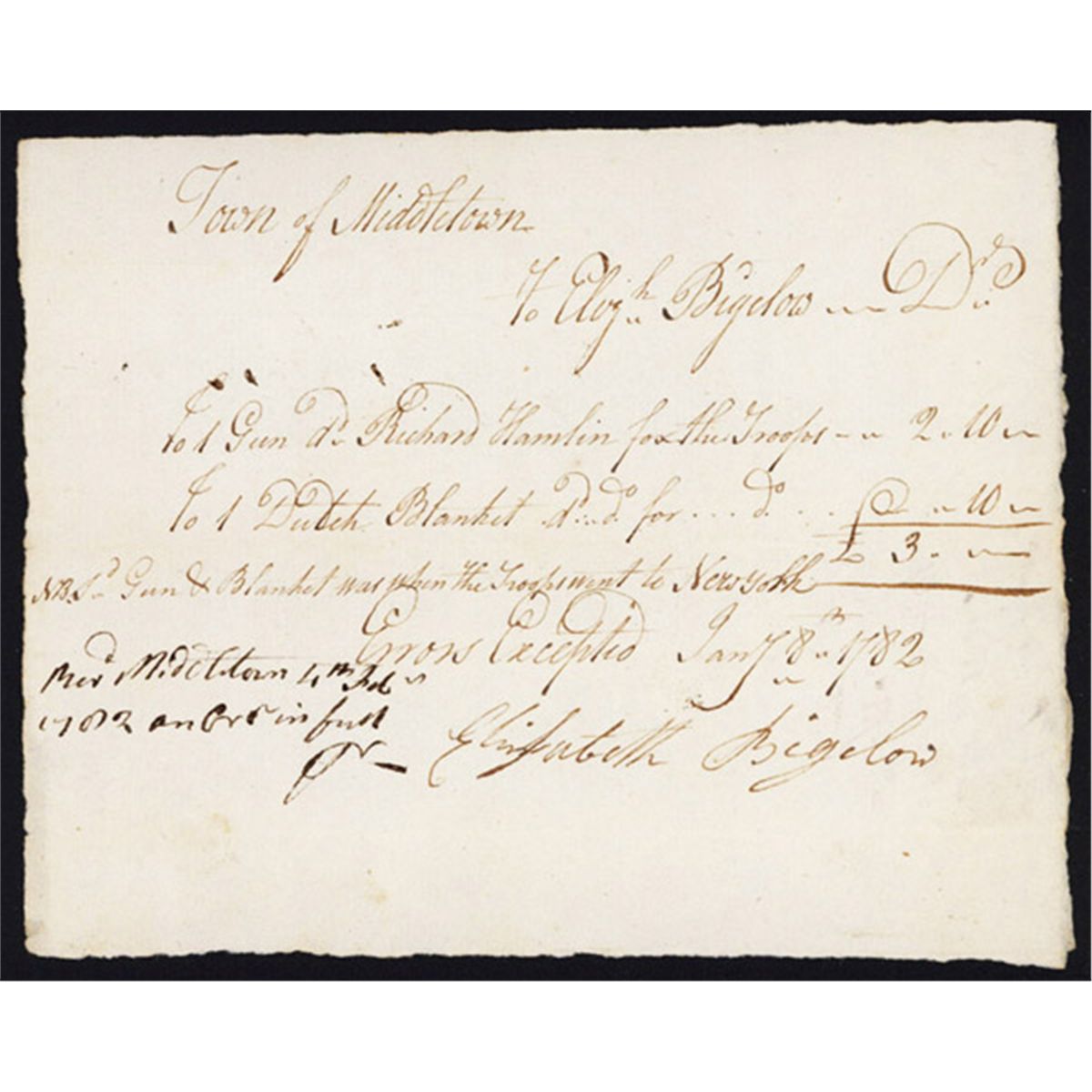 Middletown, Connecticut, Jan.8 1782, Manuscript receipt, for 3 Shillings to D. Richards for a gun “For the Troops “, a “Dutch Blanket “ was when the troops went to New York. Signed Elizabeth Bigelow. Rare colonial receipt for repayment of loaning gun and blanket to the army.
