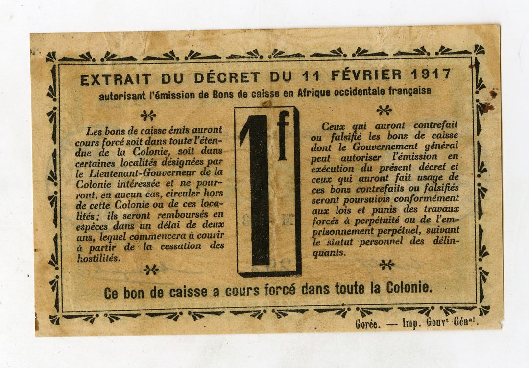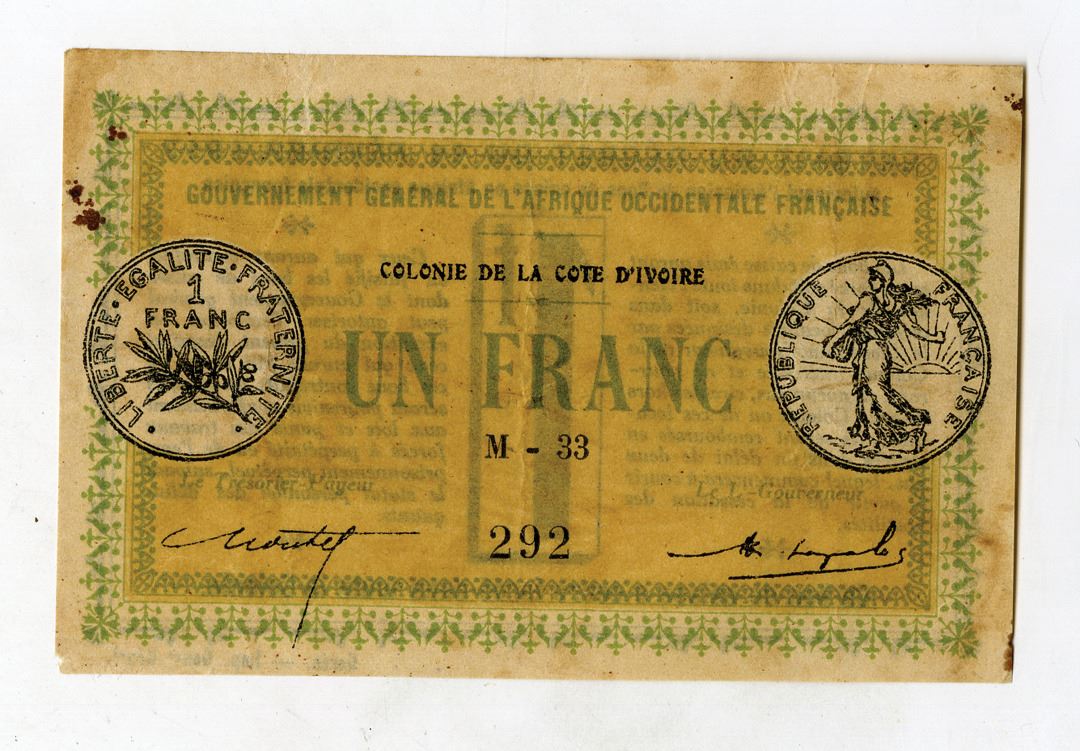Ivory Coast, D.1917. 1 Franc, P-2b, Issued Banknote, Black and green on yellow underprint, Obverse and reverse of French 1 Franc coin at left and right, Back is black with text, S/N M-33 292, Fine-VF condition with staining.