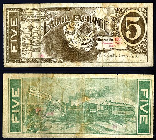 Denver, Colorado. 1896. 5 Unit. P-Unlisted, Branch 158, Denver, Colorado, “Balance Due Bearer in Labor or the Products of Labor”, on top left, S/N 29 Face is brown with globe with small vignettes of farmers plowing and laboring in middle, back is green with ornate vignette of locomotive with woman on front with “Clear the Track” going through a sign that states “Stop Progress”. Fine to VF condition with toning. Signed by Persifor M. Cooke and J. Hogeboom, Choice Fine condition, Rare Western Branch of labor organization that began as a result of the Labor war of 1894 that engulfed the entire nation from railroads to miners.