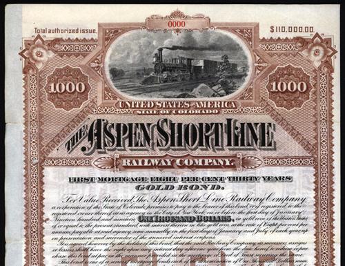 Aspen, Colorado, 1889. $1000, 1st Mortgage, 8%, 30 years, Gold Bond. Locomotive printed in black speeding R-L on top with red-brown border and underprint, Specimen overprints, POC's, S/N "0000". Coupons attached, XF to Choice XF condition. Unlisted railroad in Cox and unique in archive. This is a trophy railroad bond and would enhance the most advanced of collections. Early Colorado Railroads are difficult to find and this Aspen and also mining related railroad is amazing. ABNC.