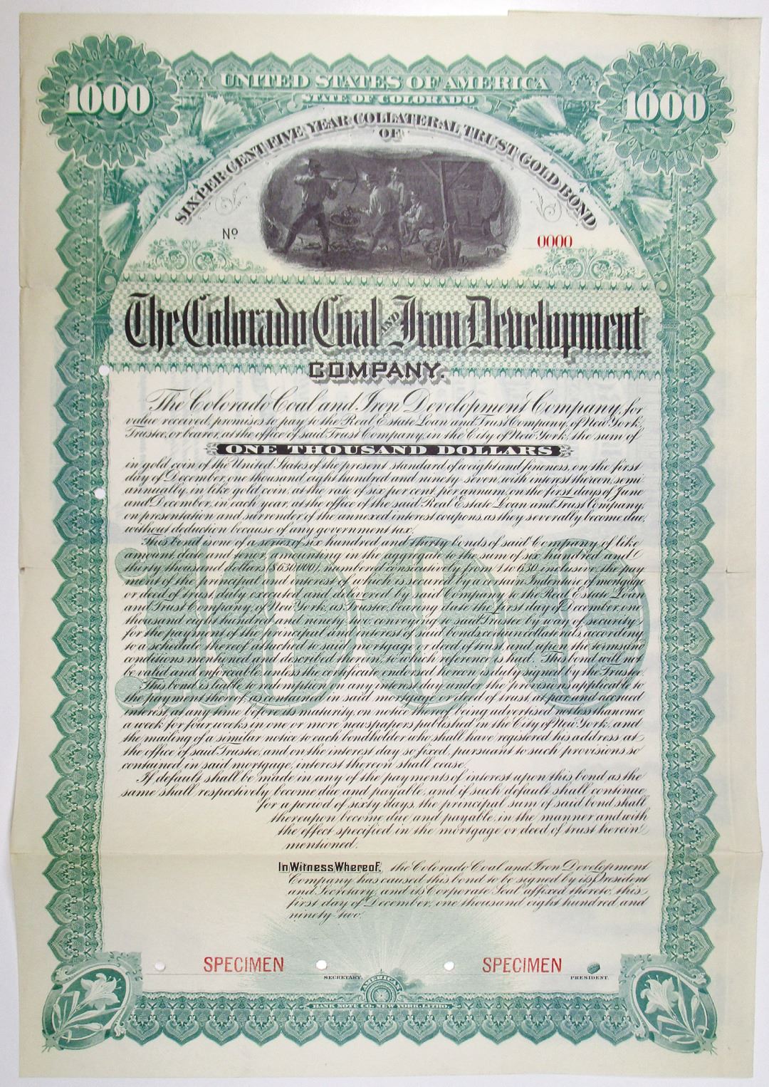 Colorado, 1892. $1000 Specimen 6% Collateral Trust Gold Coupon Bond, Black text with ornate green border and underprint, Men at work in mine at top center. Red specimen overprints, 0000 serial numbers, and POCs. Fine condition, ABNC.