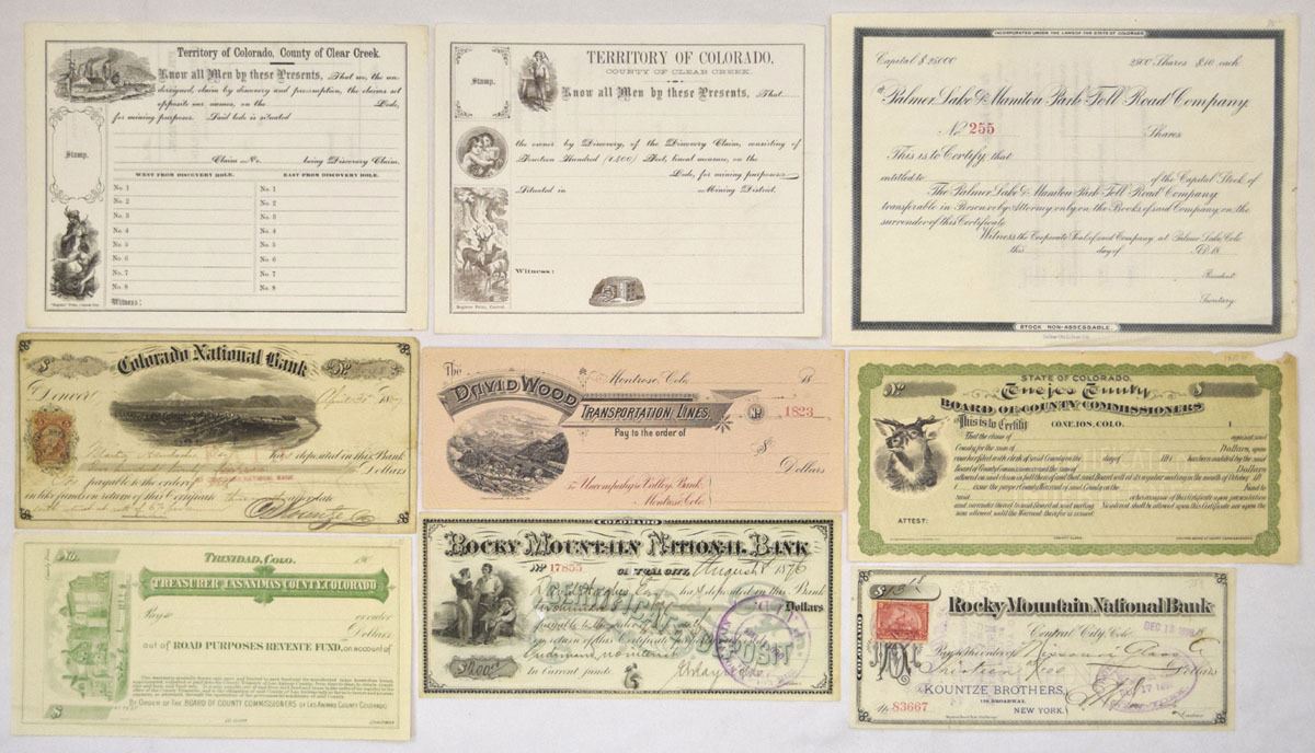 Colorado Territory & Colorado, 1870-80s. Lot of 9 Issued and Unissued mining, banking, county, and transportation documents representing early Colorado territorial and state history. Includes Territory of Colorado, County of Clear Creek mining claim forms; Palmer Lake & Manitou Park Toll Road Co. stock certificate; Colorado National Bank check; Rocky Mountain National Bank check; David Wood Transportation Lines draft; Treasurer of Las Animas County revenue fund document; and Conejos County Board of County Commissioners certificate, among others. Designs feature mining vignettes, elk imagery, frontier allegorical scenes, engraved borders, and revenue stamps. Condition ranges from Fine to VF+ overall, with folds, edge wear, punch cancellations, and normal handling. (9). Sold “AS IS” no returns accepted.