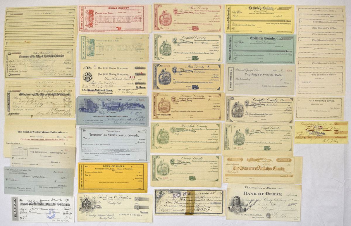 Colorado, 1880-1910s. Lot of 72 Issued county warrants, town warrants, municipal receipts, bank drafts, and related financial documents representing Colorado county and mining camp finance. Includes examples from Kiowa County; Mesa County; Crowley County; Hinsdale County; Eagle County; Ouray County; Las Animas County; Arapahoe County; Town of Nucala; City of Leadville; City Marshal’s Office forms; The First National Bank; The Bank of Victor; Bank of Ouray; and other regional institutions. Designs feature engraved county seals, allegorical figures, ornate borders, and period typography, with multiple revenue stamps and cancellation markings present. A substantial Colorado municipal and mining-era fiscal group spanning county treasuries, town funds, and regional banking operations. Condition ranges from Good to Very Fine overall, with folds, edge wear, punch cancellations, staining, and normal handling. (72). Sold “AS IS” no returns accepted.