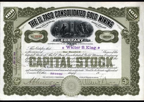 Denver, Colorado, 1914. 100 Shares, Issued and uncancelled, Black on olive green underprint and frame, miners in middle top, XF condition, Attractive and scarce Colorado mining company, Hamilton BNC.