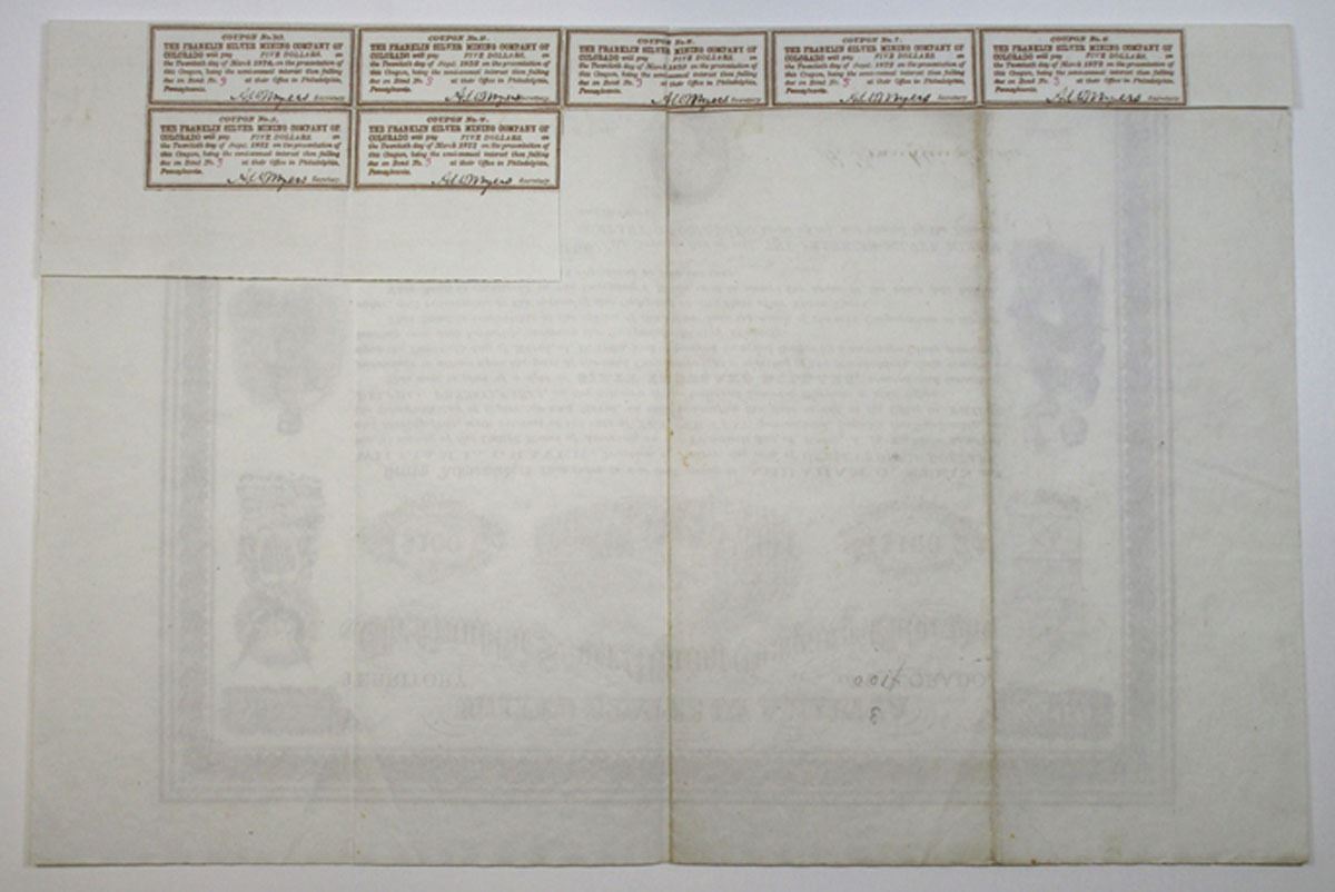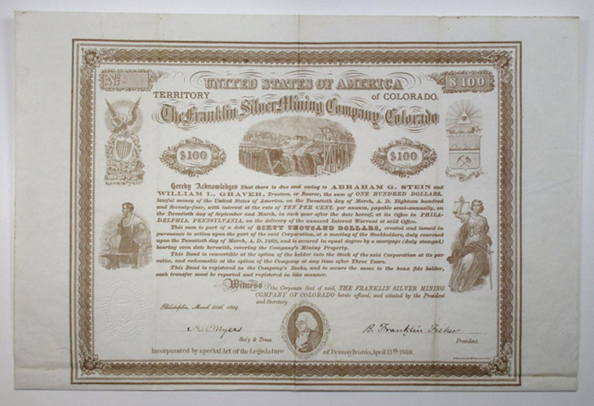 Colorado Territory, 1869. $100 I/U 10% Coupon Bond, Brown text with brown border, S/N 3, Signed by B. Franklin Fisher as company president. Mining scene depicted at top center, Eagle with American shield at top left, Man with anvil at bottom left, Seal of Colorado at top right, Allegorical Justice at bottom right, Ben Franklin at center bottom, and embossed company seal at bottom left. VF condition with pronounced fold lines, but in great condition for its age. Benjamin Franklin Fisher (1834-1915) enlisted in the Civil War in 1861, serving in the 32nd Pennsylvania Volunteers. In August, 1861, Fisher’s regiment arrived in Washington by train, and soon after he was detailed to the Signal Camp of Instruction, to assist Major Albert Myer in creating the Signal Corps. Generally, a signal officer’s mission was to produce intelligence reports. While shadowing Confederate columns near Aldie, Virginia, Fisher was captured and sent to Libby Prison. On February 9th, 1864, 109 prisoners tunneled out of Libby Prison, with Fisher leading the second party of ten. He eventually found his way back to Union Lines at Williamsburg, and eventually earned the rank of Brigadier General, resigning in 1866. After the war Fisher practiced law in Philadelphia and was active in many financial ventures, including mining. Historic bond signed by a notable figure in the Civil War.