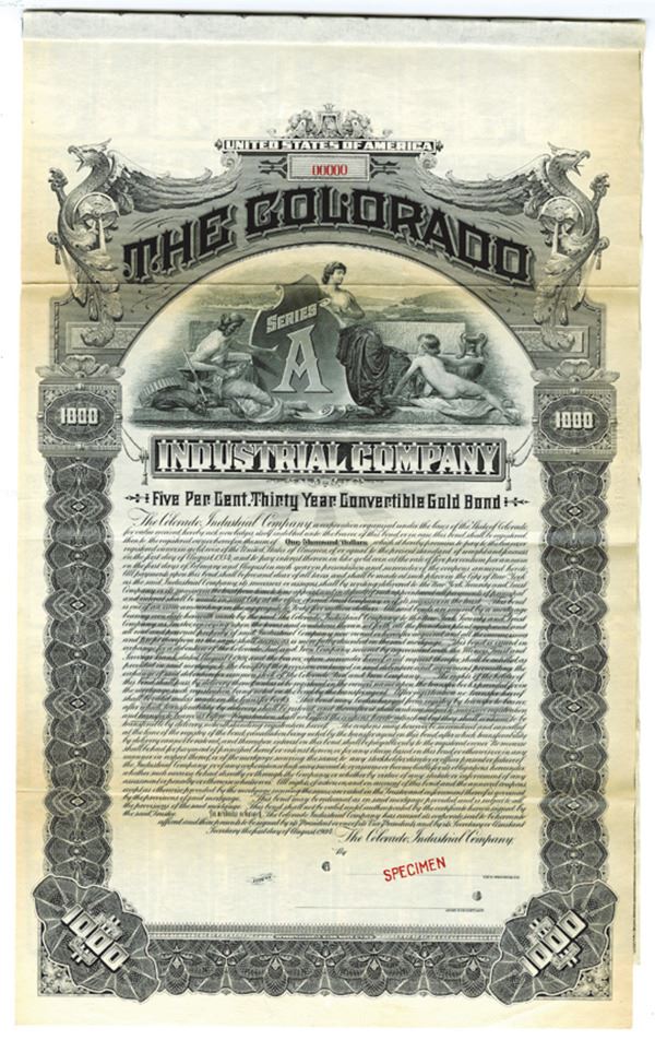 Colorado. $1000 5% Convertible Gold Coupon Bond, Black print on ornate and large gray border and under tint, Allegorical women and children sitting together, Specimen overprints and POC's, Fine condition with major splitting along fold lines condition, International BNC.