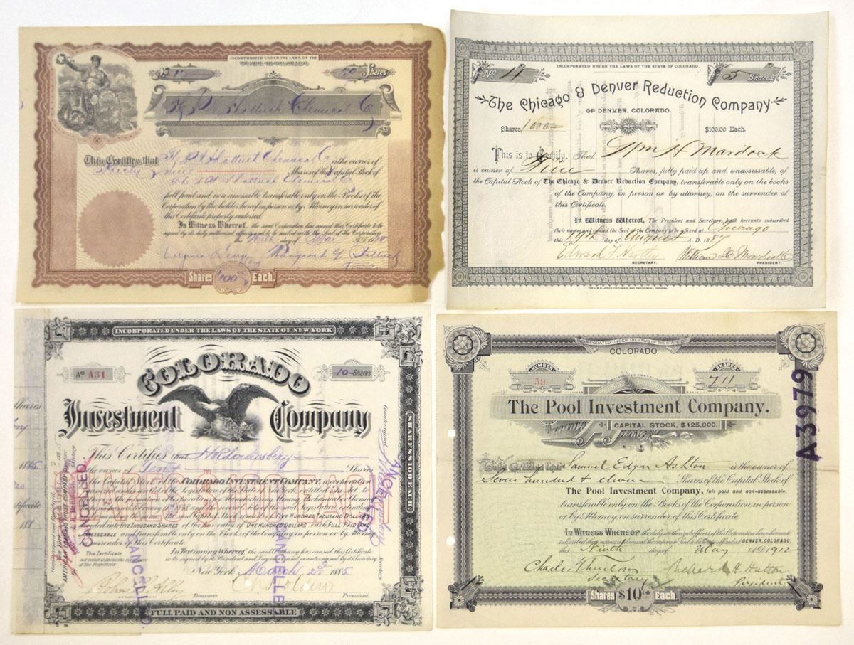 Colorado, 1885-1920. Lot of 4 Issued Stock Certificates, Includes: 1885, I/C, Colorado Investment Co., 10 Shares Capital Stock Certificate; 1887, Chicago & Denver Reduction Co., I/U 5 Shares Capital Stock Certificate; 1912, Pool Investment Co., 711 Shares I/U Capital Stock Certificate, S/N 59; and, 1920, H. L. Reduction Chemical Co., 39 Shares Capital Stock I/U Certificate. Condition ranges from Fine to XF. (4). Sold "AS IS" no returns accepted.