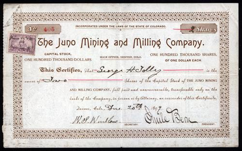Colorado, 1899, 5 Shares, Cert. #10, I/U stock certificate, Brown with no underprint or vignette, Revenue Stamp attached, Fine condition.