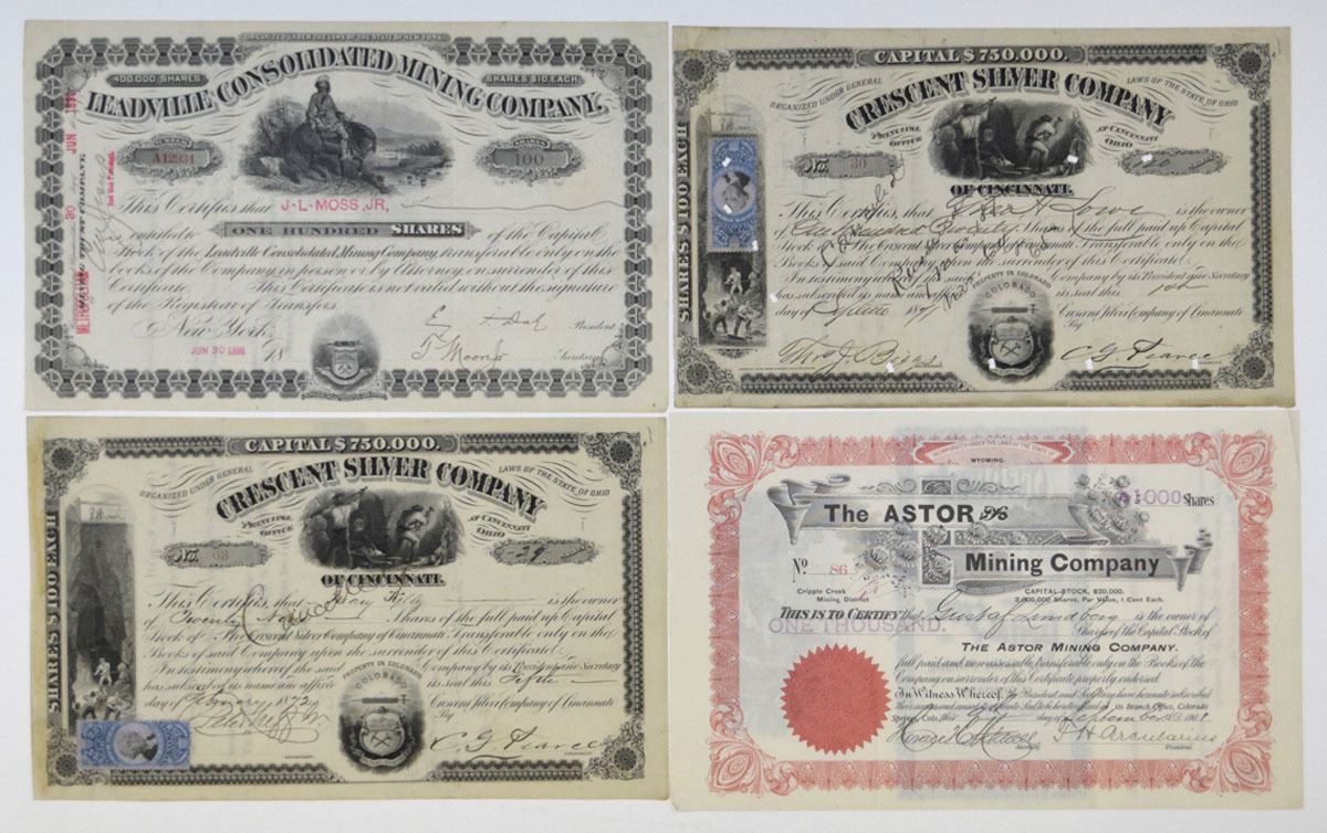Colorado, 1871-1901.... Lot of 4 I/U and I/C Stock Certificates, Includes: 1871 & 1872, Crescent Silver Co. of Cincinnati (2), I/C; 1898, Leadville Consolidated Mining Co., I/U, National BNC; and, 1901, Cripple Creek, CO., Astor Mining Co., I/U. Condition ranges from VF to XF. (4).
