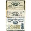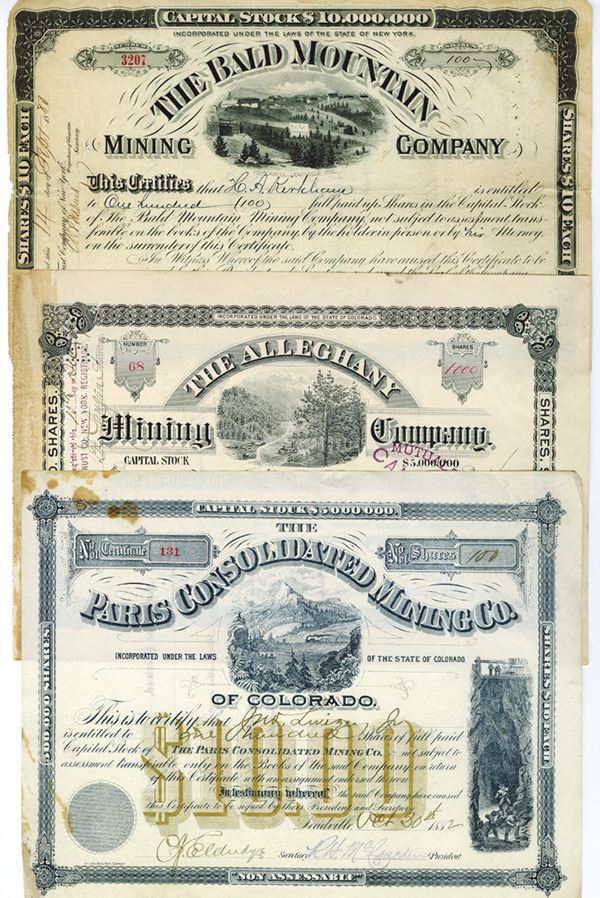 New York & Colorado. 1) Bald Mountain Mining Co.,1880, 100 Shares Capital Stock Issued Certificate, Black print on black border, Ariel view of mountain at top, Fine condition with damage to margins, FBNC. 2) Alleghany Mining Co., 1887, 1000 Shares Capital Stock Cancelled Certificate, Black print on black border, Ariel view of mining community at top, Fine condition with damage to left margin, Cancelled overprints and POC's, Collier & Cleveland Lith. 3) Paris Consolidated Mining Co., 1882, Issued Stock Certificate, Blue print on blue border, View of mountain at top with men in mine at right side, Fine condition with damage to left margin, St. Louis BNC.