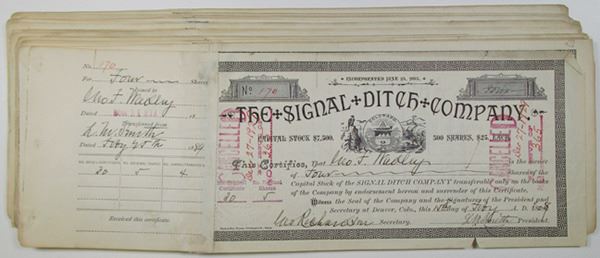 Denver, CO. Lot of 26+ Issued stock certificates, all are I/C Capital Stock Certificate, Black text with black border, Colorado State Seal at center. VG with tears to VF condition. The Signal Ditch Company was responsible for the construction of Signal Ditch located in the Denver Metro area. Signal Ditch is an irrigation ditch surrounding Brighton, Colorado. (26+)