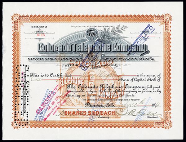 Colorado, 1907, Odd Shs., Issued Stk., Brown border with brown telephone underprint Vignette, VG, Attractive and desirable early Colorado certificate.
