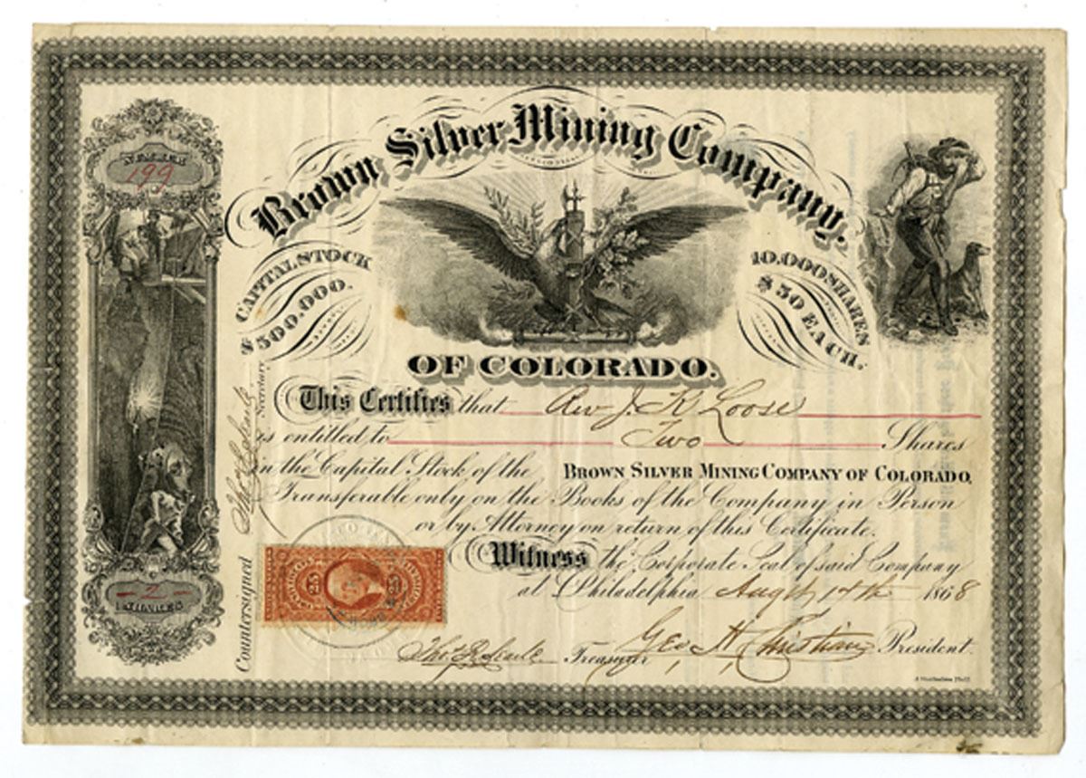 Colorado Territory....., (Incorporated in Pennsylvania), 1868. 2 Shares, I/U Capital Stock Certificate, Black print with black border, Bald eagle at center under title with miner at right and mining vignette down left side, 25 cent revenue stamp at bottom left, S/N 199, VF to XF condition. J. Haehnlen Phil. The company was incorporated in the late 1860s during the silver boom in Georgetown, Clear Creek County, which was one of the richest silver camps of the period. The company’s name is often associated with the “Brown Lode” or Brown vein, which was one of the early silver discoveries in the Georgetown district. The certificate was issued in 1868, which was a peak year of speculative formation of silver mining companies in Colorado, especially in New York, and Philadelphia, as Eastern capital chased after new silver finds following the success of mines like the Terrible and Equator.
