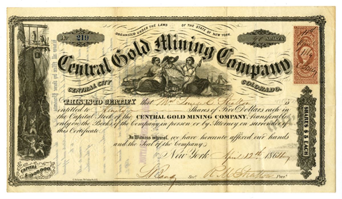 Central City...., Colorado (Incorporated in New York), 1864, Central Gold Mining Co., 90 Shares Capital Stock Certificate. Black print with a black border; features the Arms of New York beneath the title, a detailed mining vignette along the left margin, and a revenue stamp at the upper right corner; serial number 219; issued and signed by C.O. Jones. The Central Gold Mining Co. operated in Central City, Colorado, a settlement founded amid the Pike’s Peak Gold Rush when John H. Gregory discovered the Gregory Lode in 1859, initiating the "Richest Square Mile on Earth" mining district. By 1864, Central City had evolved beyond its early placer mining roots into a sizable town with growing infrastructure, supplying miners and drawing sizable investment from the East. VF to XF condition.