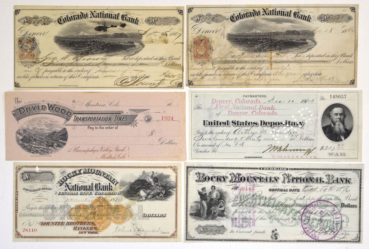 Colorado Territory & Colorado..., 1866-1903. Lot of 6 Checks, Includes: Colorado National Bank, 1866-67, I/U Check Pair with Revenue Stamps at left; 1874 & 1876, Rocky Mountain National Bank, I/C Check Pair; ND (1880s), David Wood Transportation Lines, U/U Check; 1903, United States Depositary, I/C Check. Checks range from Fine to VF+ condition. (6). Sold "AS IS" no returns accepted.