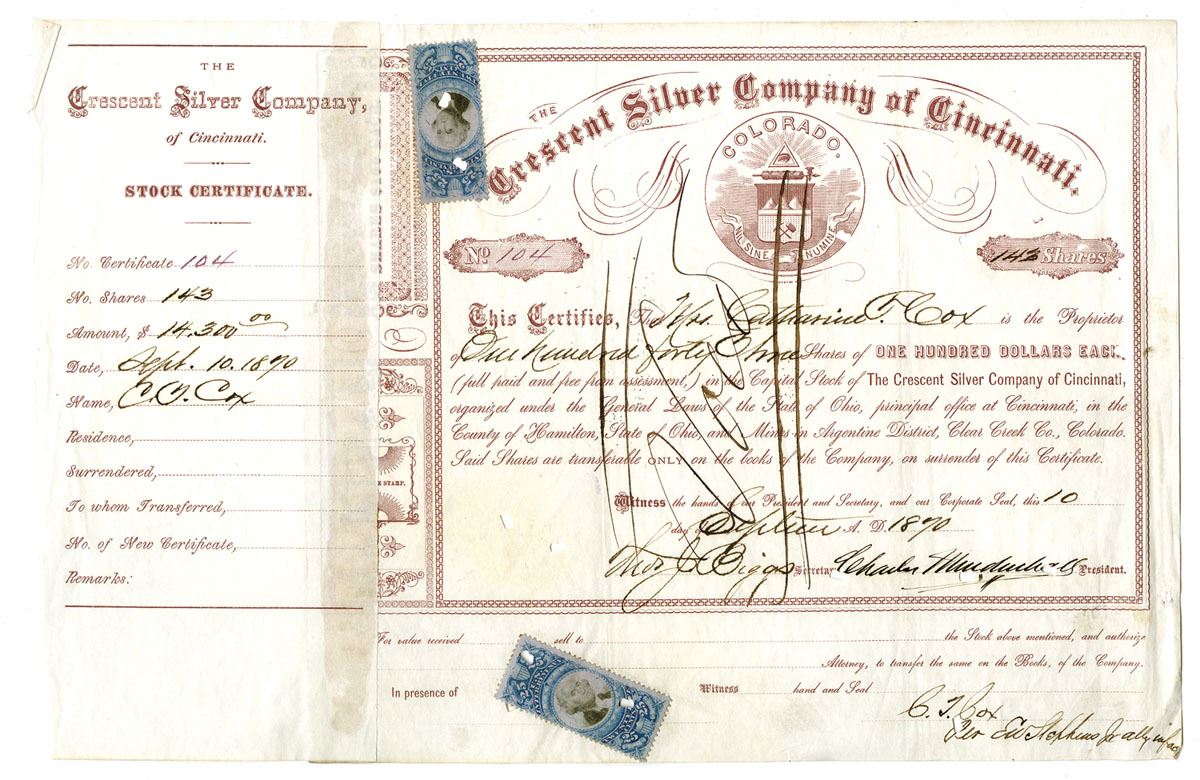 Colorado Territory, 1870. 141 Shares Capitol Stock I/C Certificate, Brown/ Purple print and border with seal of Colorado at top of certificate under company title, 2 blue revenue stamps on certificate, POC's and void written across in large letters. Fine condition.