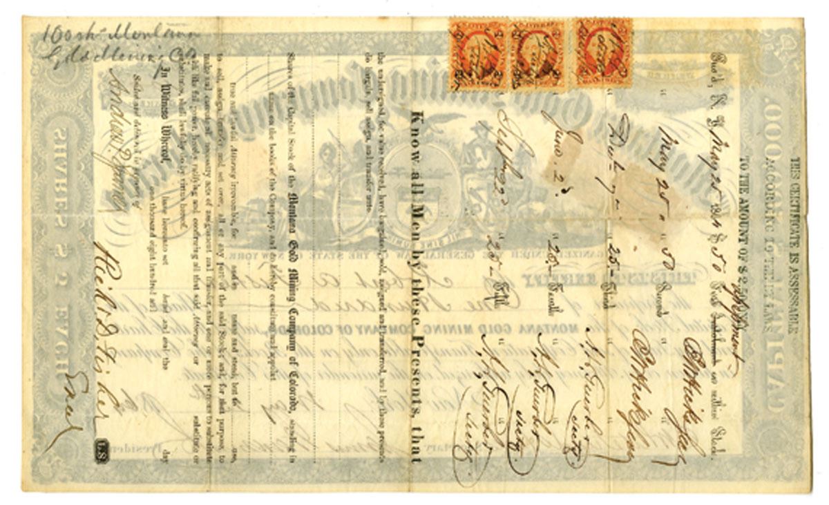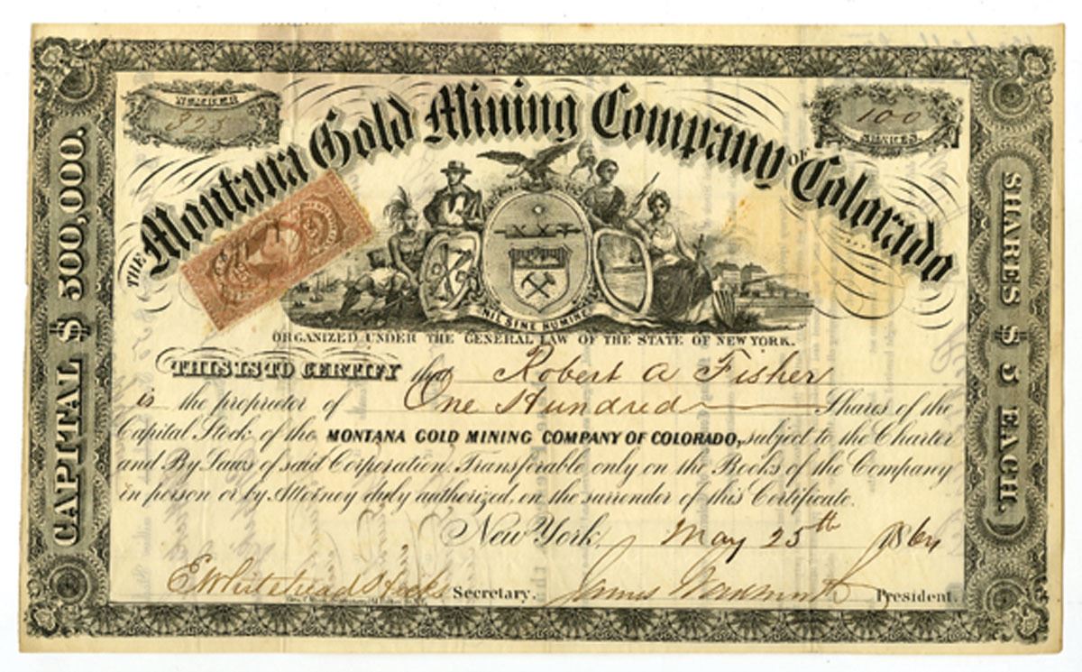 Colorado Territory.... (Inc. and Offices in New York, NY), May 25, 1864, Montana Gold Mining Company of Colorado, 100 Shares at $5 each, I/U stock certificate; S/N 325, ornate black border with central vignette of allegorical figures flanking a shield and eagle, with revenue stamp affixed; organized under the laws of New York; signed by company officers; VF to Choice VF condition or better