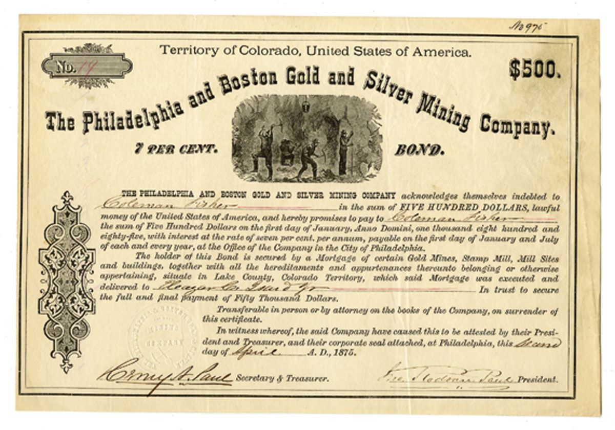 Colorado Territory (offices in Philadelphia, Pennsylvania), 1875, The Philadelphia and Boston Gold and Silver Mining Company, $500 Bond, 7% Interest. Issued in 1875, this $500 bond of the Philadelphia and Boston Gold and Silver Mining Company was secured by mortgages on mines, stamp mills, and properties in Lake County, Colorado Territory. Printed in black on cream paper, the certificate features an engraved vignette of miners working underground, flanked by ornate borders and embellished with the company’s embossed seal. The bond carried a 7% annual interest rate, payable in Philadelphia, and reflects the common practice of Eastern capital markets financing Colorado’s mining development during the silver and gold rush era. Signed by company officers and bearing the official seal, Choice VF to XF or better.