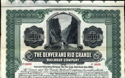 1908. $1,000. Specimen 1st and Refunding Mortgage 5% Gold Bond. Green border. Tracks in Royal Gorge. Red specimen overprints, POC's and "00000" serial numbers. Coupons attached. VF condition. Rare certificate. Unlisted bond and variety in Cox. ABNC.