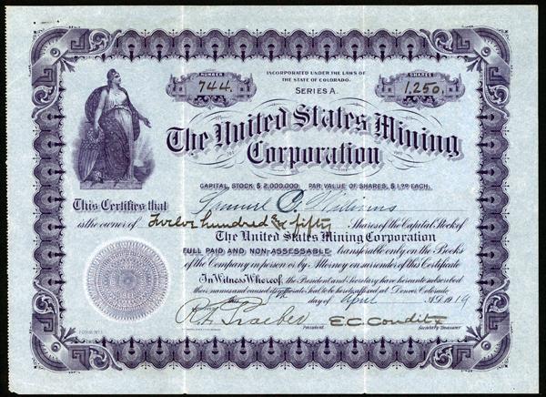 Colorado, 1919, Horizontal 1250 Shares, #744, Issued and Uncancelled Stock certificate, Dark Blue border on blue paper with Allegorical woman vignette, Company Seal, XF.