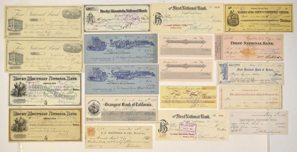 Colorado...., California and Various States, 1858-1929. Lot of 19 Bank Checks and Drafts of early financial instruments from various Colorado and Western institutions, notably Rocky Mountain National Bank (Central City), First National Bank of Canon City, First National Bank of Cripple Creek, Treasurer of the City of Cripple Creek, First National Bank of Helena (Montana), and Grangers Bank of California, among others. Several feature vignettes of bank buildings, allegorical figures, and mining scenes. A few are imprinted with revenue stamps or bank handstamps, with notable examples from Longmont Farmers Milling & Elevator Co. and The Holladay Overland Mail & Express Co., Virginia City, Montana Territory. Conditions range from Fine to VF overall, showing light folds, toning, and occasional cancellation holes. (19). Sold ‘AS IS’ no returns accepted.