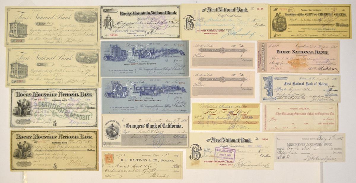 Colorado...., California and Various States, 1858-1929. Lot of 19 Bank Checks and Drafts of early financial instruments from various Colorado and Western institutions, notably Rocky Mountain National Bank (Central City), First National Bank of Canon City, First National Bank of Cripple Creek, Treasurer of the City of Cripple Creek, First National Bank of Helena (Montana), and Grangers Bank of California, among others. Several feature vignettes of bank buildings, allegorical figures, and mining scenes. A few are imprinted with revenue stamps or bank handstamps, with notable examples from Longmont Farmers Milling & Elevator Co. and The Holladay Overland Mail & Express Co., Virginia City, Montana Territory. Conditions range from Fine to VF overall, showing light folds, toning, and occasional cancellation holes. (19). Sold ‘AS IS’ no returns accepted.