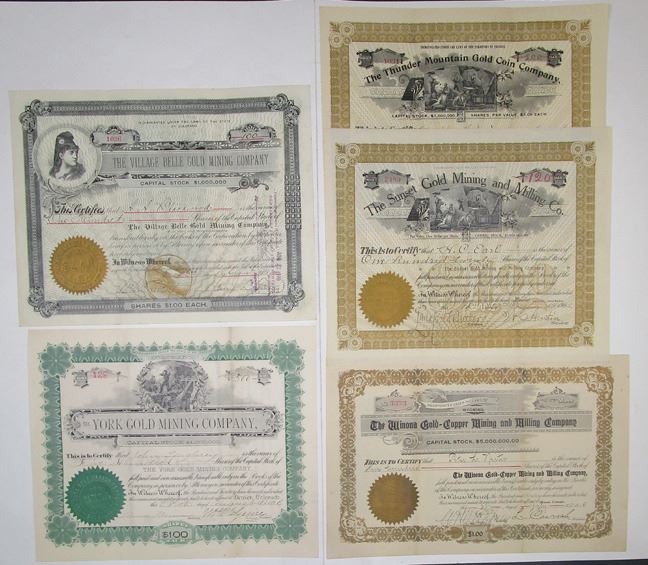 Colorado, Wyoming, Arizona, 1898-1910. Lot of 5 I/U Mining Stock Certificates, Includes: Denver, 1896, York Gold Mining Co., 500 Shares Capital Stock; Denver, 1910, Winona Gold-Copper Mining and Milling Co., 500 Shares Capital Stock; Colorado, 1900, Village Belle Gold Mining Co., 100 Shares Capital Stock; Denver, 1905, Thunder Mountain Gold Coin Co., 500 Shares Capital Stock; and, Denver, 1905, Sunset Gold Mining and Milling Co., 120 Shares Capital Stock. All pieces range from VF to XF condition. (5). Sold "AS IS" no returns accepted.