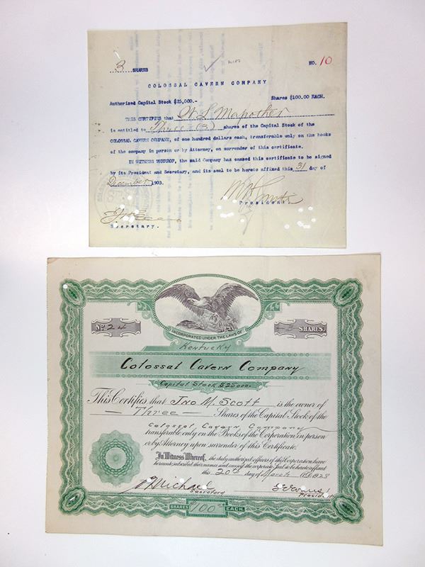 Kentucky. Lot of 2 certificates, includes 3 Shares Capital Stock I/C Stock Certificate S/N 10, completely typewritten, and 3 shares, Black print on green border, Bald Eagle at top, Low serial number-24, POC's along bottom, Fine-VF condition. Colossal Cavern is a cave in Kentucky, United States, the main entrance of which is at the foot of a steep hill beyond Eaton Valley, and 1.5 miles from Mammoth Cave. It is connected with what has long been known as the Bedquilt Cave. Several entrances found by local explorers were rough and difficult. They were closed when the property was bought in 1896 by the Louisville & Nashville railway and a new approach made. From the surface to the floor is 240 feet (73 m) under Chester Sandstone and in the St. Louis Limestone. Fossil corals fix the geological age of the rock. The temperature is uniformly 54 °F (12 °C), and the atmosphere is optically and chemically pure. There are gypsum rosettes and helictites