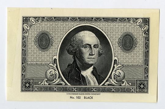 Washington, D.C., 1880-1900s. Color Sample Page from the Columbian Bank Note Co., 7 cm x 11.5 cm, Black intaglio printed with "No. 102 BLACK" underprint, George Washington vignette at center with a surrounding ornate banknote design and border. Uncirculated with same tape on the left excess margin. CBN.