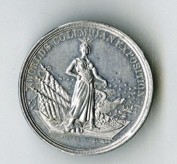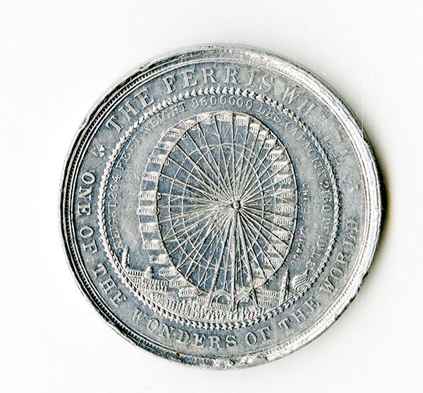 Columbian Exposition, Chicago. 38mm Aluminum medal featuring female standing and Ferris Wheel statistics. Rim with some nicks, otherwise Extremely Fine.