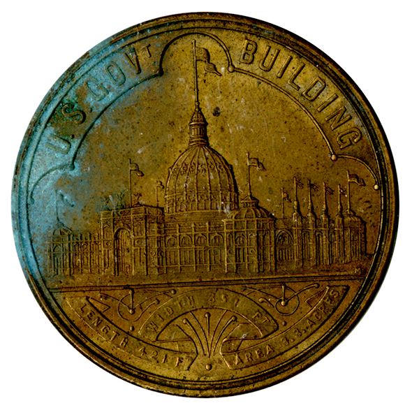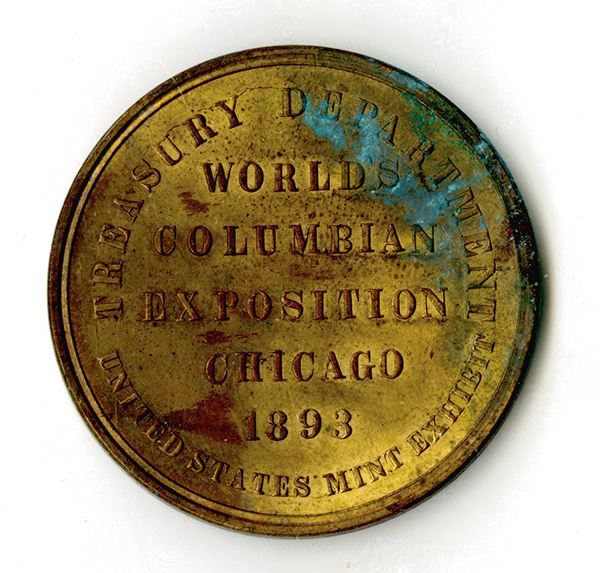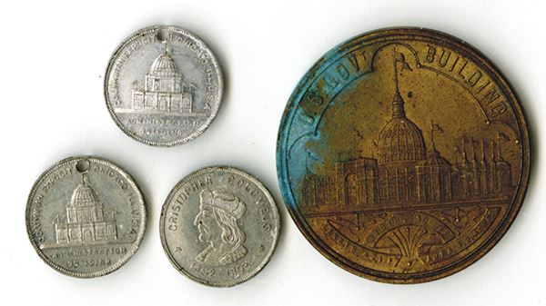 Christopher Columbus and Administration Building (2). 18mm. All uniface, the latter is pierced. Extremely Fine or better.3 pieces. Struck Brass medal from the fair showing US Government building. Verdigris. 37mm. 4 pieces total.