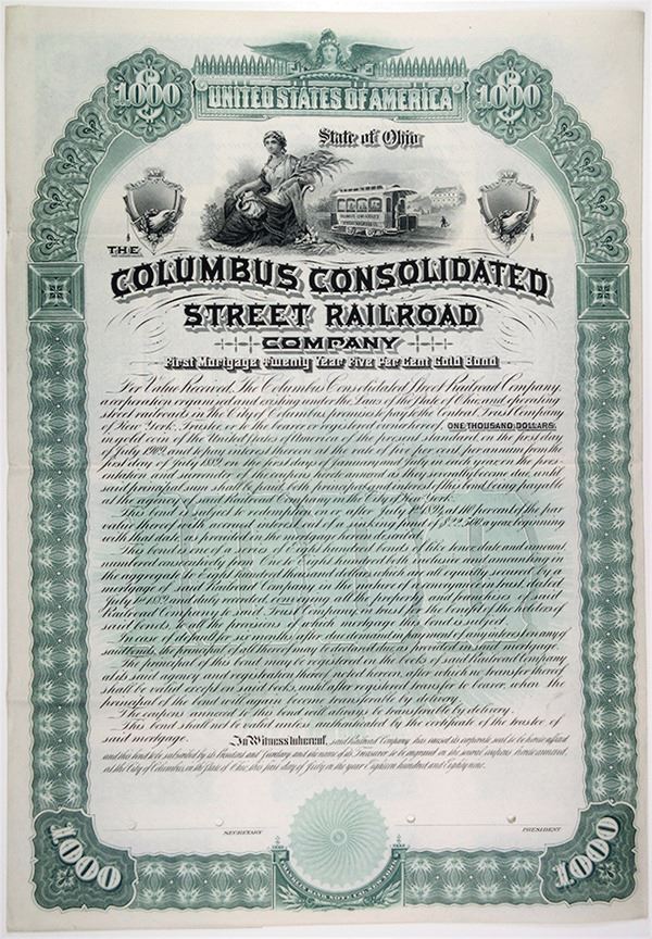 Ohio. 1889, $1000 Specimen 5% First Mortgage Gold Coupon Bond, Black text with green border and undertint, Allegorical figure of Prosperity seated next to passing trolley, flanked by identical shields with eagles, all above company name. POC's. VF FBN, Rare and only known as a specimen in Cox.