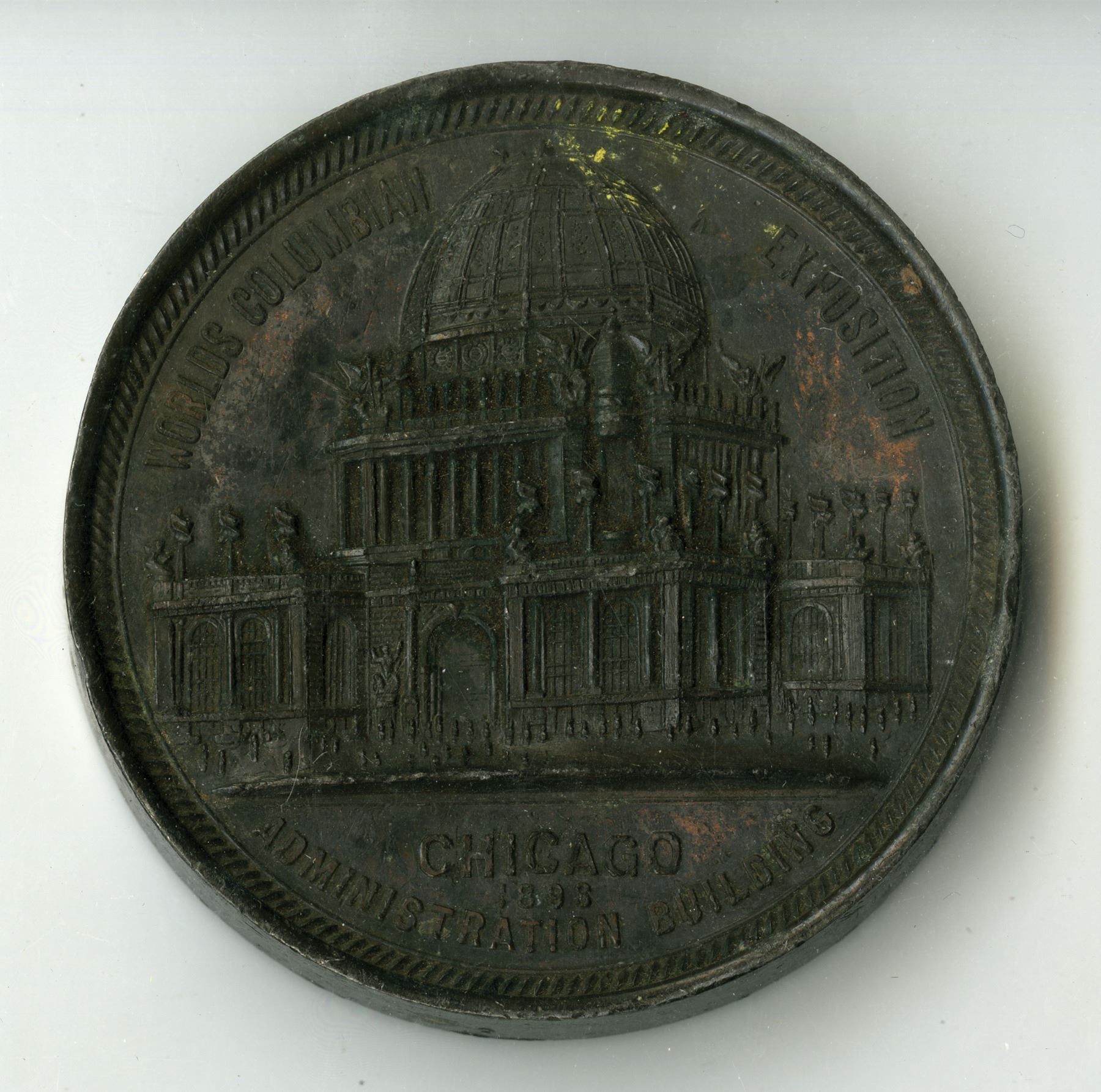 Chicago, Illinois. 68 mm diameter, 8.4 mm thickness, copper, Expo Administration building on one side, Portrait of Columbus on the other side, AU condition with a little wear on Columbus nose and buttons of his shirt (all high spots), still attractive and large medal.