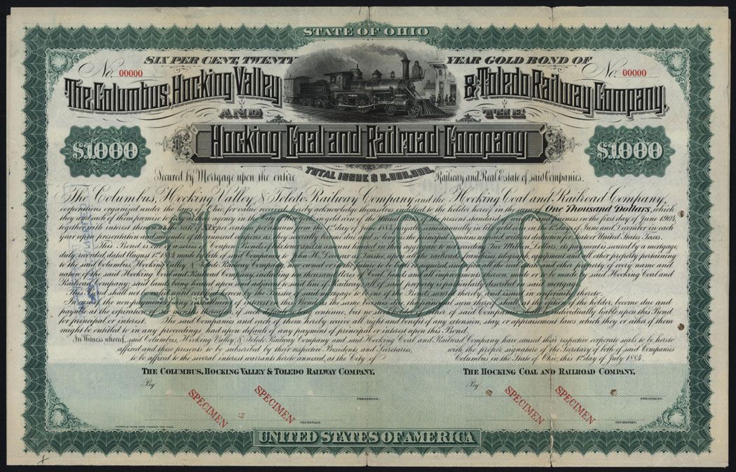 Ohio, 1884, $1000, Specimen 6% 20 Year Gold Specimen Bond, Horizontal format, Coupons attached, Black on green border and underprint, Locomotive moving into station top center, VF condition with vertical splitting on the borders, ABNC. Unlisted bond and railroad in Cox.