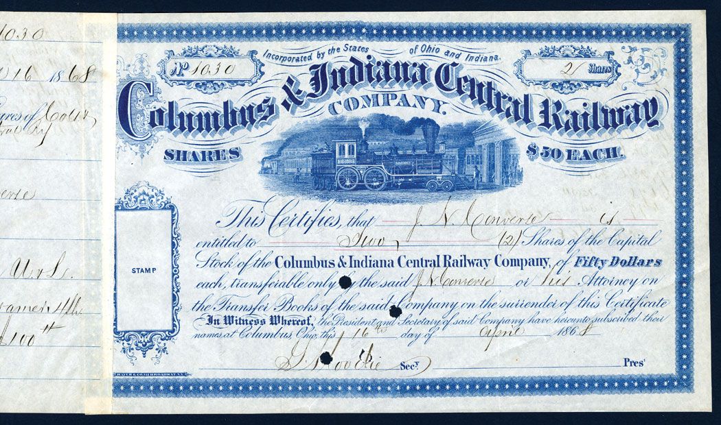 Ohio and Indiana, 2 Shares, U/C, Partially issued, blue, locomotive "America" L-R, VF.