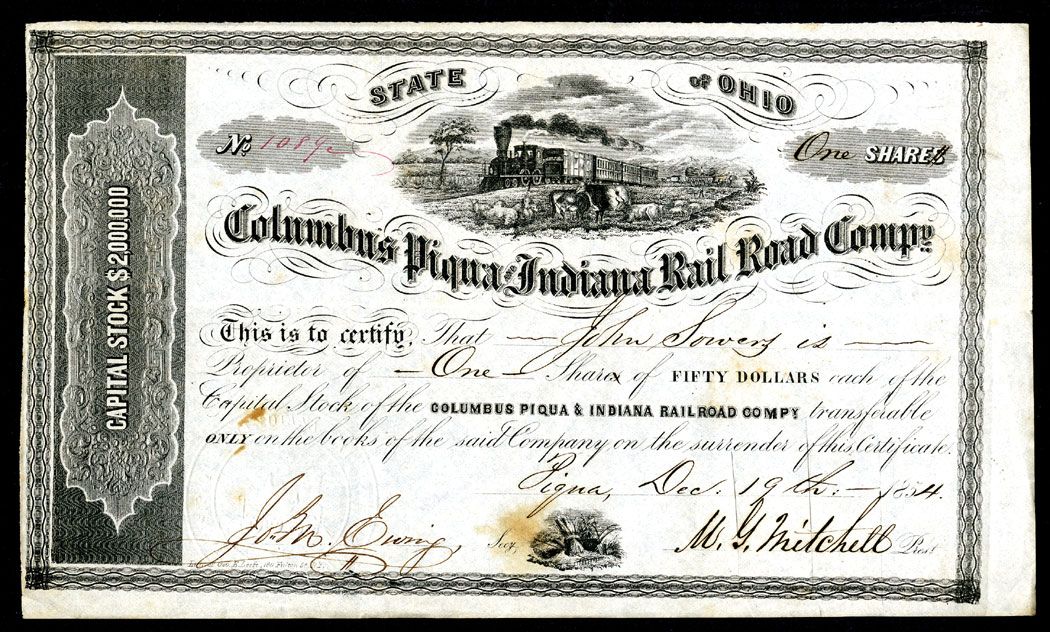 Piqua, Ohio, 1 Shares, I/ U, Black, locomotive passing cows R-L, VF.