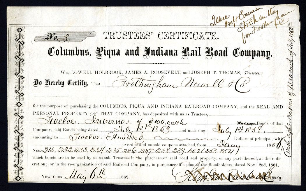 Ohio. 12 Shares at $100 each, I/C, plain form, ornate title S/N 3, VF.