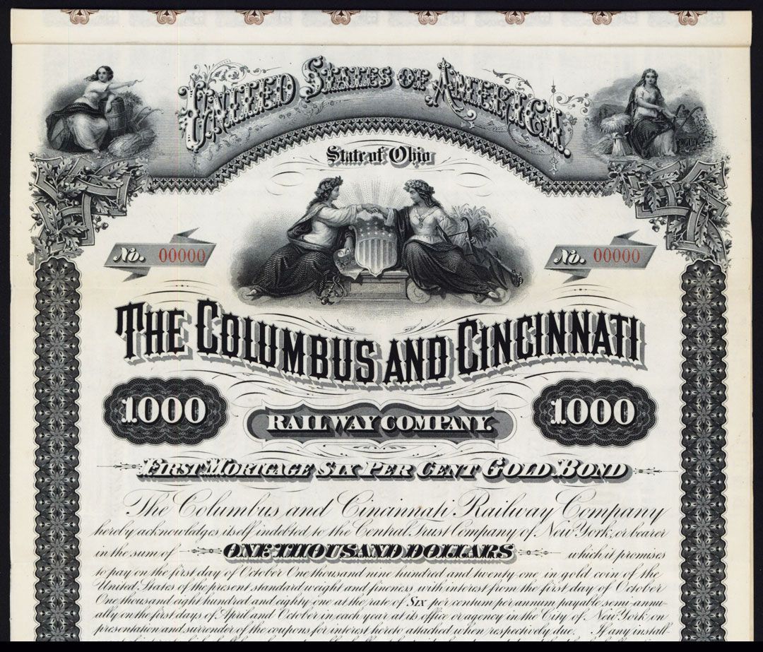 Ohio, 1881, $1000, 1st Mortgage 6 % Gold Bond Specimen, Coupons attached, Black with no underprint, Allegorical women shaking hands over patriotic shield flanked by allegorical agricultural women on top left and right corners, POC's, XF condition. ABNC, Unlisted bond design and date in Cox catalog.