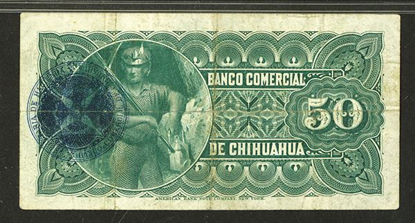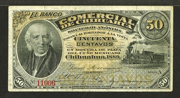 Chihuahua, Mexico, 50 centavos, P-S125a M81a, Issued banknote, Black on light yellow-brown, Hidalgo at left, train at right, back green with miner, S/N A 11066, PMG graded Very Fine 30, ABNC.