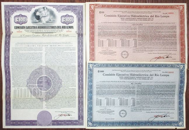 El Salvador, 1950. 3 pieces: 100 Colones Specimen 5% Bond in Spanish, purple; 1000 Colones Specimen 5% Coupon Bond in Spanish, blue; 100 Colones Specimen 5% Coupon Bond in Spanish, brown. All have red specimen overprints, 00000 serial numbers, and POCs. Fine-VF condition, ABNC. (3)