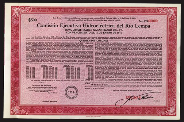 El Salvador, 1950. 500 Colones Specimen 5% Coupon Bond in Spanish, Black text with pink border and background. Red specimen overprints, 00000 serial number and POC. VF condition, ABNC.