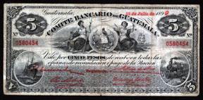 Guatemala. Lot of 2 notes. Both are 1899 Issues. Includes 1Peso. P-S191 Issued banknote. Black with no undertint, steamship on LL, locomotive on LR and Arms of Guatemala flanked by allegorical women, back orange-brown. Good+ to VG condition with splits, tatty borders with chips and small pieces missing from edges but still a presentable example of this scarce note. 5 Pesos, P-S192, issued banknote. Same face design and vignettes as 1 Peso note. Fine+ condition with firm paper and good color and only a very small corner nick. A great example of this rare issue that is infrequently seen in any condition. HBNC