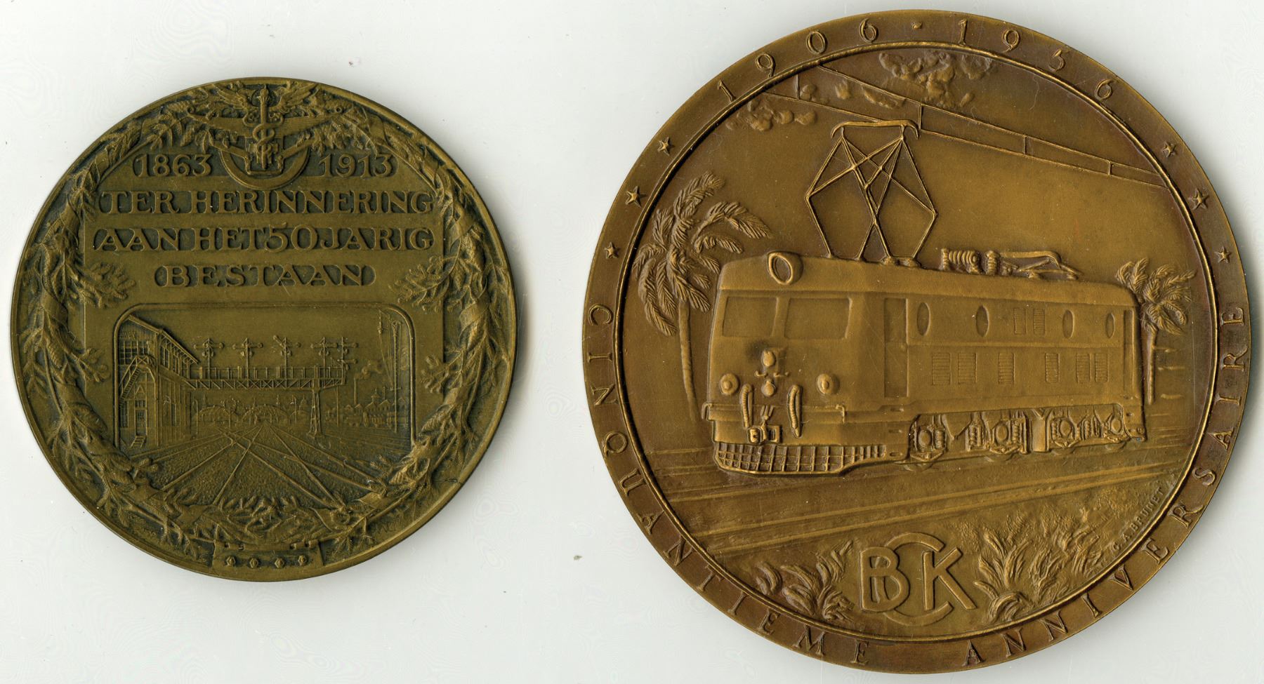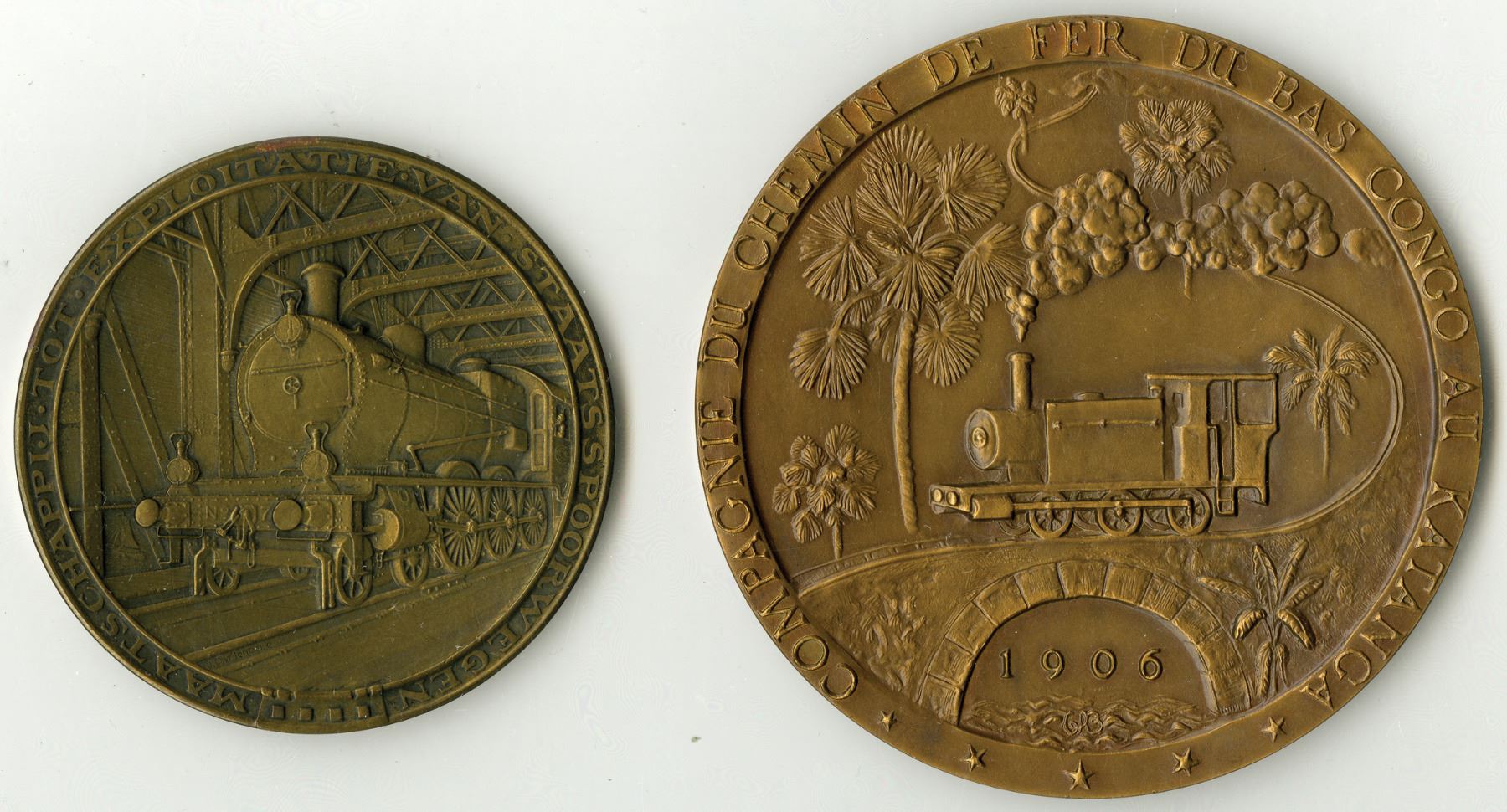 Lot 2 pieces: Belgian Congo.... Bronze medal 1956 for the 50th Anniversary of the Compagnie du Chemin de Fer du Bas Congo au Katanga, Obverse features train passing over bridge, Reverse with an electric trolly car passing on tracks; Second piece is a Netherlands Bronze medal 1913 to commemorate the 50th Anniversary of the Society to Operate State Railways, Obverse with train passing on tracks, Reverse features scenes of tracks. (2)