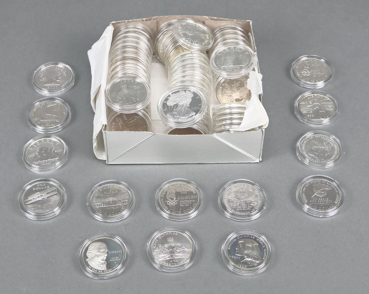69 in total, the majority of issues represented by a proof and an uncirculated example of each type, all in original plastic holders and in superb Uncirculated or Proof Condition; each coin has .7734 ounces of silver for a total of over 50 ounces (69). Shipping charges apply - weight 5.8 lbs. (photo on web site)