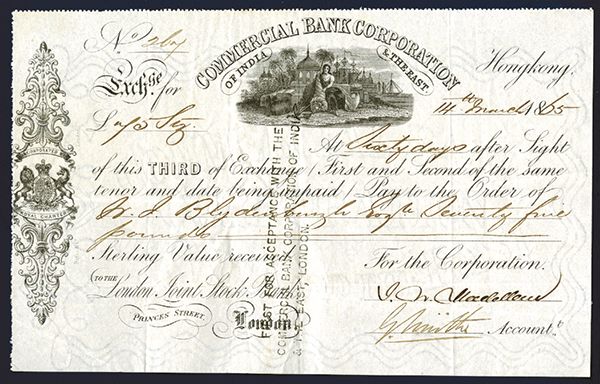 Hong Kong, 3rd of Exchange Draft, 75 Pounds Sterling, Black on watermarked light pink-orange paper, Seated Britannia with lion and crown in middle. VF. Scarce early Hong Kong fiscal item.