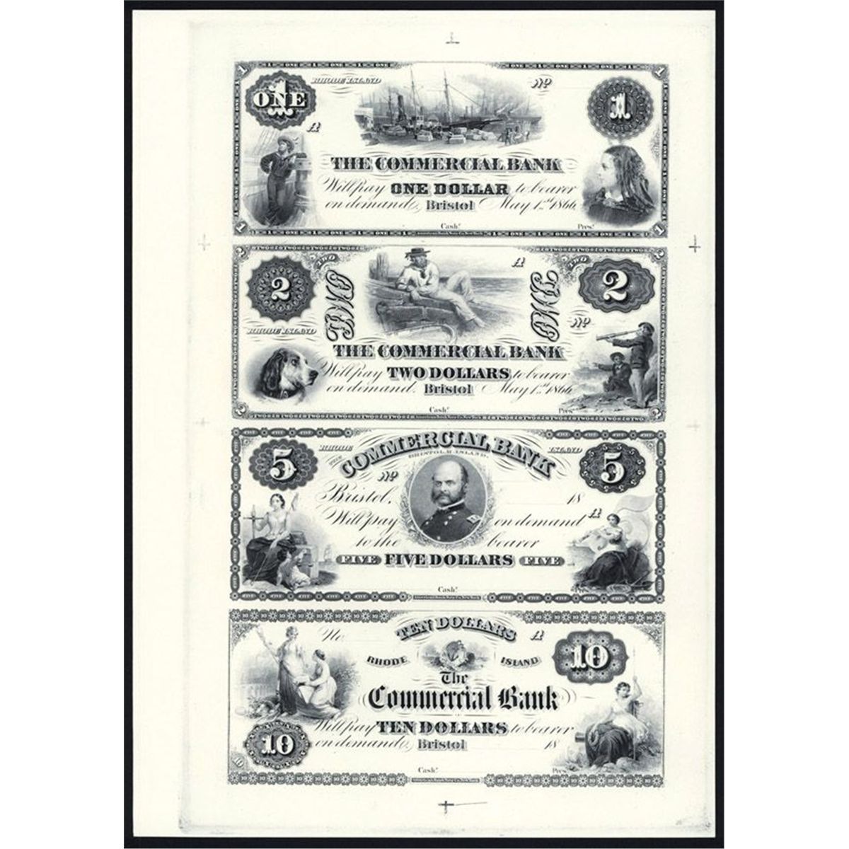 Bristol, Rhode Island. Lot of 4 notes (uncut sheet of 4), 18xx (ca.1970's), $1-2-5-10, (RI-30-G9a; G28a; G46a; G56a), Modern “Proprietary Proofs” printed on thin white card. The $2; $5 and $10 are all listed as SENC. The $1 proof has sailor on lower left, ship at dock in middle and young woman on right; The $2 proof has dog on lower left, reclining sailor in middle and men with spy glass on lower right; The $5 proof has allegorical woman and child on lower left, Civil War officer (Burnside?) in middle and men with allegorical woman seated on the numeral 5 on lower right; The $10 note has allegorical women on the right and left with RI Arms in middle, Notches on all 4 margins for printing registration. Black printing without underprint printed on thin white card, Uncirculated condition. ABNC. Archival “Proprietary” proofs rarely seen in sheet form and these notes may only be available as proprietary proofs.